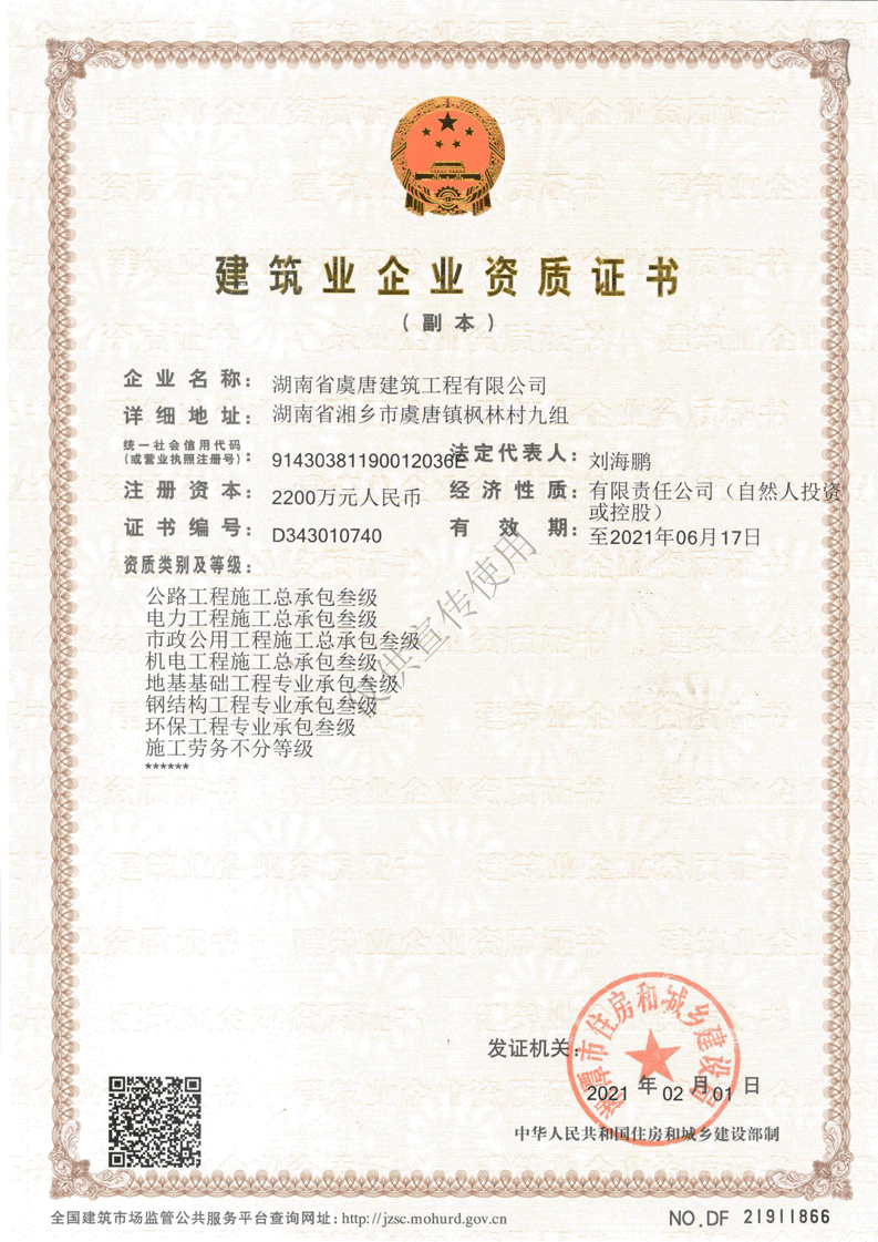 鋼結(jié)構(gòu)專業(yè)承包叁級、環(huán)保工程專業(yè)工程承包叁級、承裝(修、試)電力設(shè)施四級、路面養(yǎng)護(hù)乙級資質(zhì)、橋梁養(yǎng)護(hù)乙級資質(zhì)、隧道養(yǎng)護(hù)乙級資質(zhì)、交通安全設(shè)施養(yǎng)護(hù)乙級資質(zhì)、施工勞務(wù)不分等級等多項施工資質(zhì)。