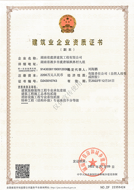 本公司具有建筑工程施工總承包貳級、消防設(shè)施工程專業(yè)承包貳級、建筑裝修裝飾專業(yè)承包壹級、特種工程(結(jié)構(gòu)補(bǔ)強(qiáng))專業(yè)承包不分等級、